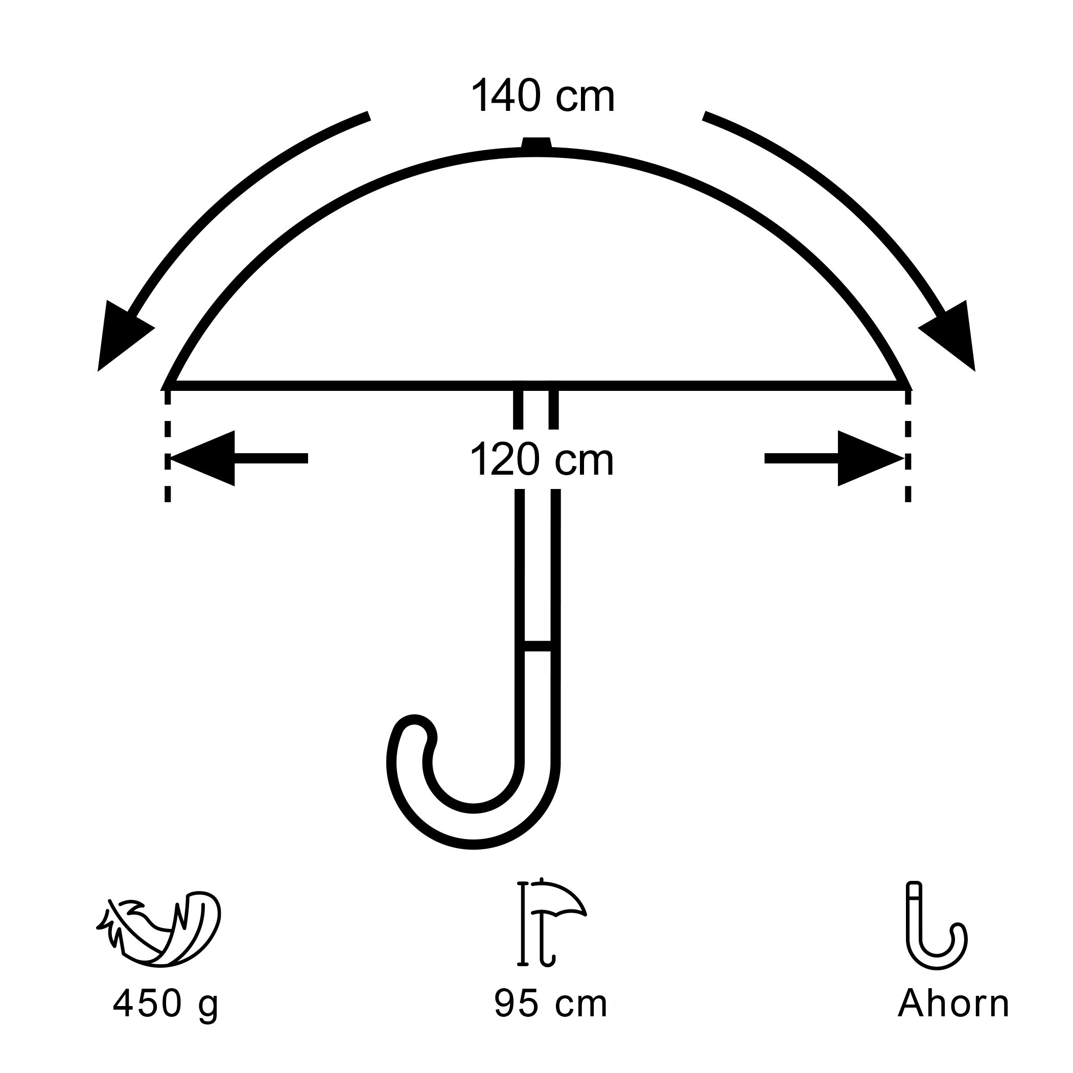 Die Schirmbespannung ist aus hochwertigem, mattem Polyestergewebe gefertigt und besitzt eine angenehme Größe. Aufbewahrt wird der klassische Stockschirm nach dem Trocknen in der im Lieferumfang enthaltenen Schutzhülle.